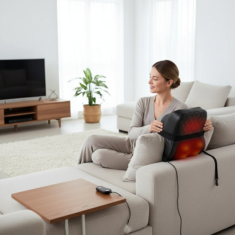 Détendez-vous instantanément avec notre masseur d'oreiller. Il fonctionne par vibrations et chaleur pour apaiser vos muscles en un rien de temps.